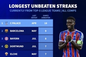 体育资讯10月1日讯 根据德转统计,水晶宫是五大联赛当前各项赛事不败场次最多的球队,他们自4月以来已经跨赛季18场不败。